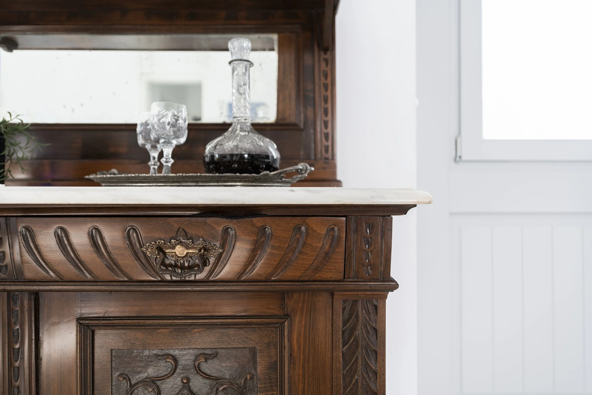Inside of the house, the role of Spolia, besides the marble counter top, is depicted by the old furniture the client owned and we reused in this project. A mostly neutral palette of whites and grays contradicts with the dark color of the old wooden furniture, on the one hand, and the vivid color of the lacquered kitchen cabinets on the other hand, creating an interesting dipole between the traditional and the contemporary.